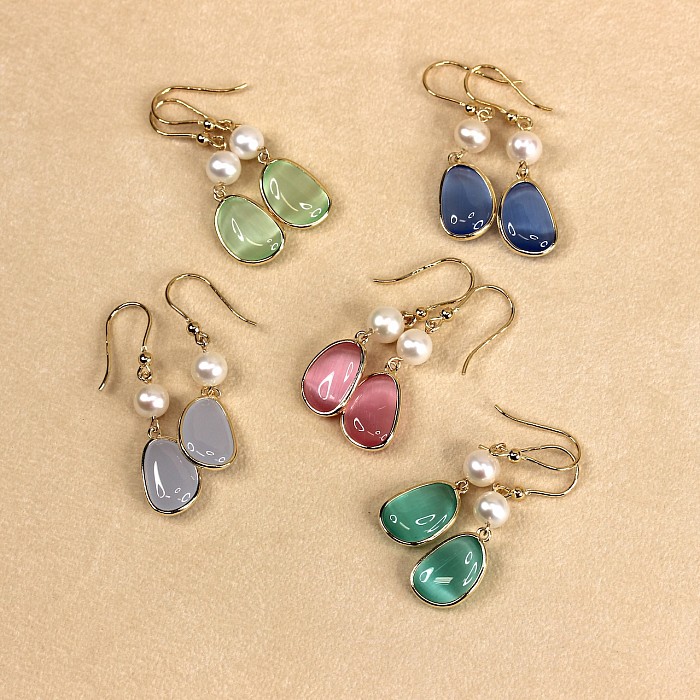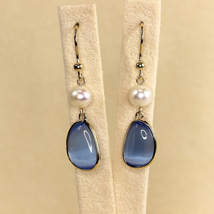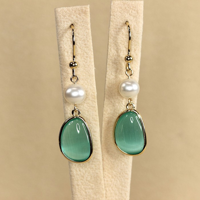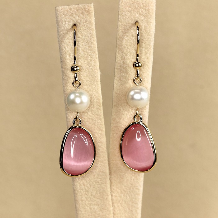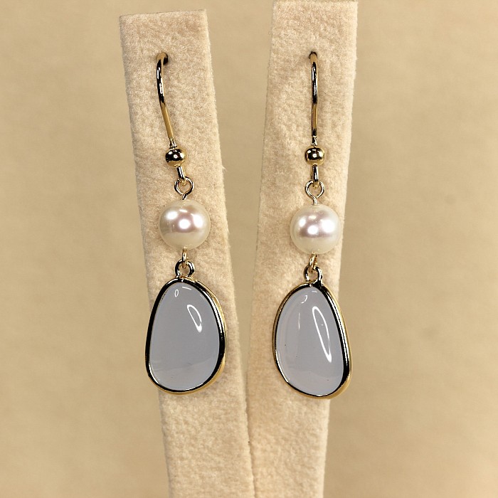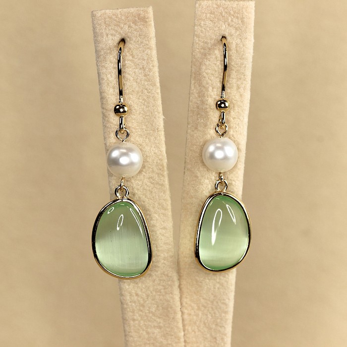 Luxusní závěsné náušnice s perlou a elegantním oválným kamenem představují dokonalou harmonii jemnosti a moderní elegance. Hladce broušený barevný kámen svým zastřeným leskem nenuceně doplňuje jemný lesk bílých perel. Čistý design vytváří dojem tichého luxusu – stylu, který nepůsobí okázale, ale přesto zaujme na první pohled.